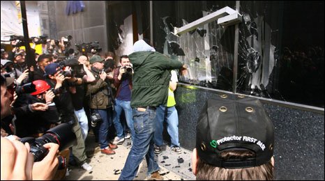 Οι δυο πρώτες από τις στημένες σκηνές βανδαλισμών στο Λονδίνο τον Απρίλιο του 2009 κατά την διάρκεια των αντιδράσεων για την σύνοδο G20, καθώς το κρατικό BBC, παρεουλα με τα άλλα μέσα πληροφόρησης καθώς χειραγωγούν «Ηδονοβλεπτικά» τα έκτροπα.